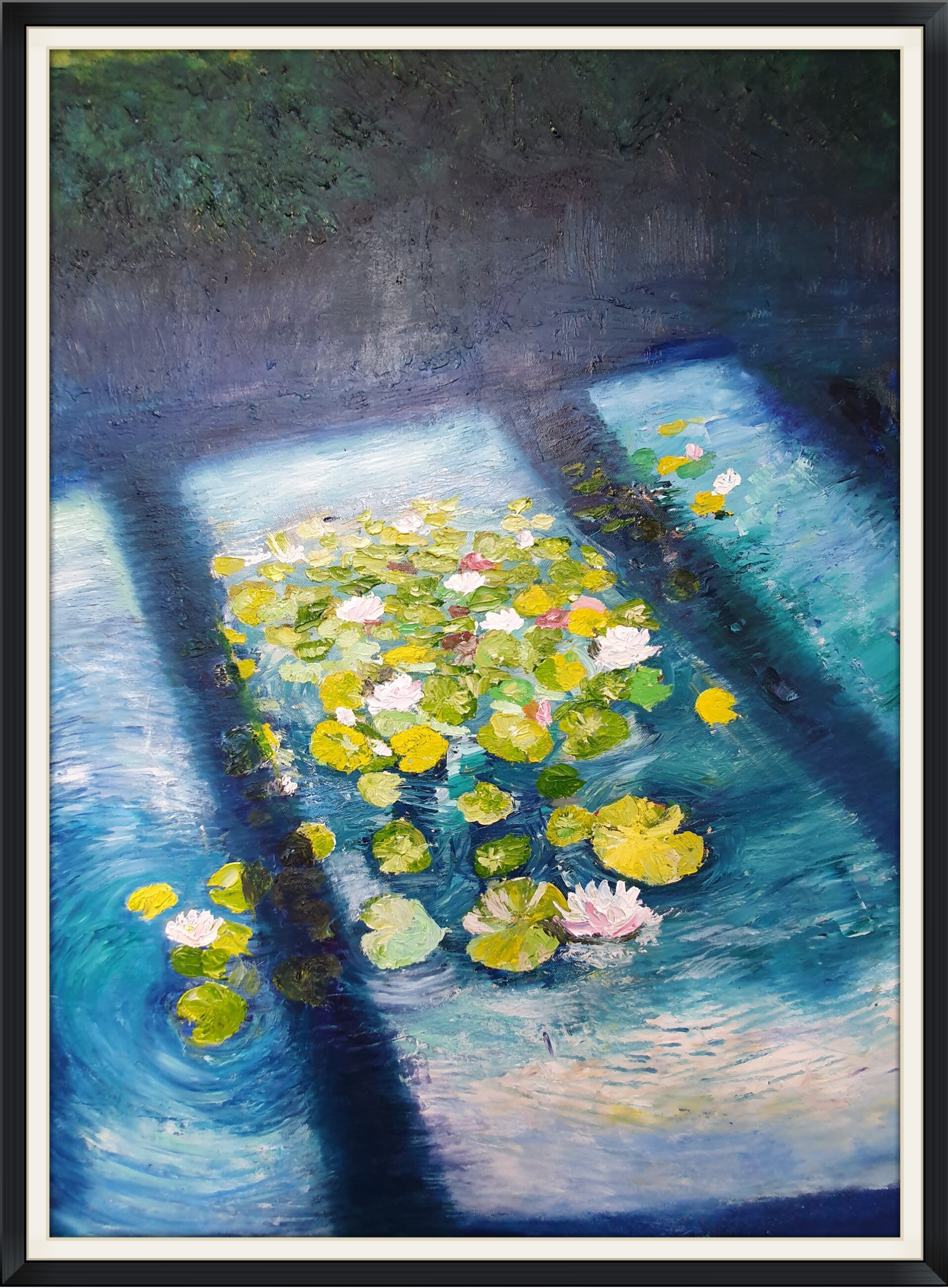This captivating oil painting of water lilies masterfully balances light and shadow, creating a stunning play of colors and textures. The deep, vibrant blue of the water forms a striking backdrop, immediately drawing the eye with its richness and intensity. Gracefully floating on the surface, the water lilies are bathed in patches of soft, radiant light, accentuating their delicate petals and intricate details. The surrounding foliage casts gentle shadows, adding depth and drama to the composition, while enhancing its dynamic appeal.